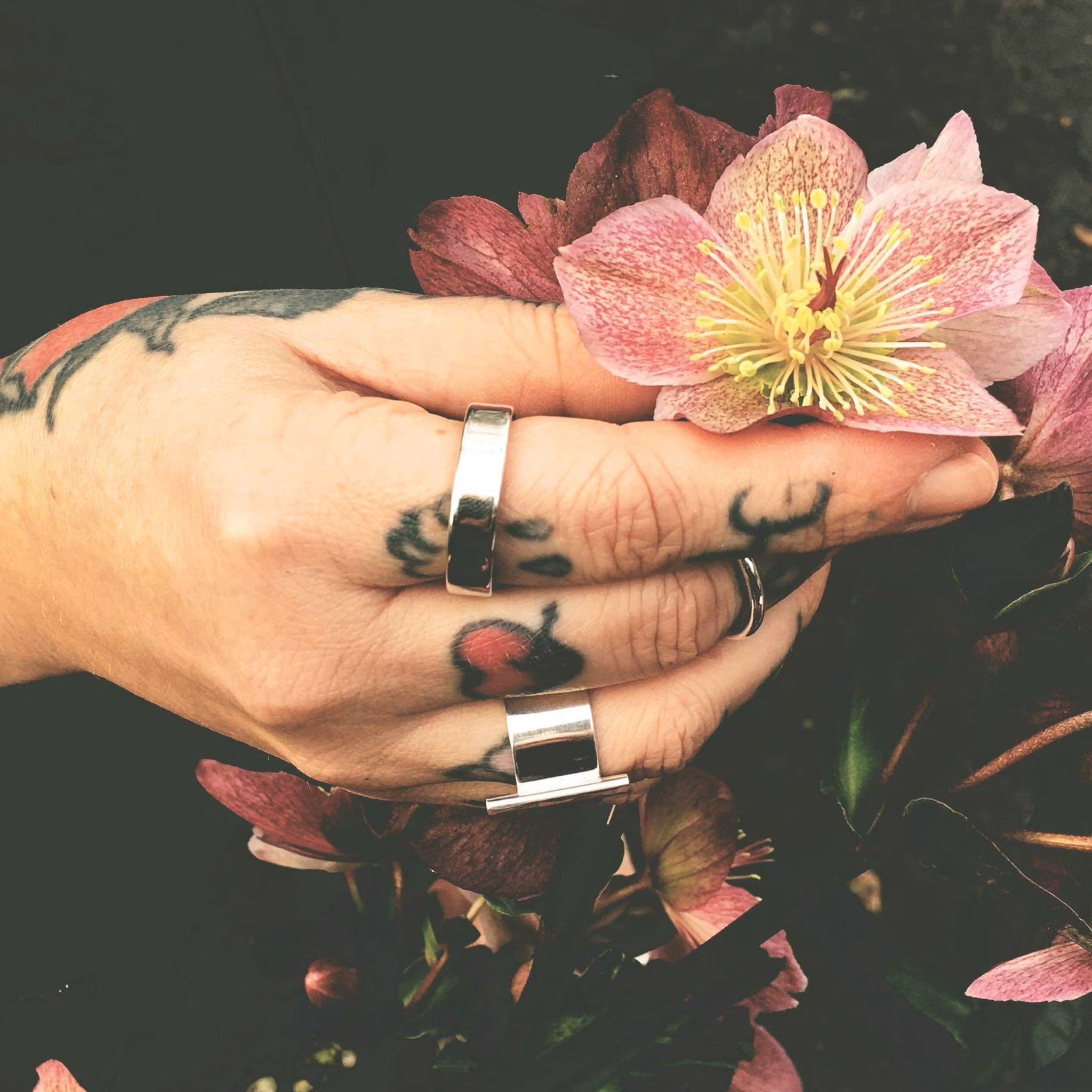 Ring Rod är en bred kraftig ring. Den klarar sig bra själv, men är även lätt att komplettera med andra ringar på samma hand.